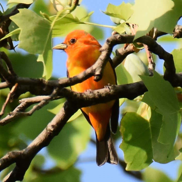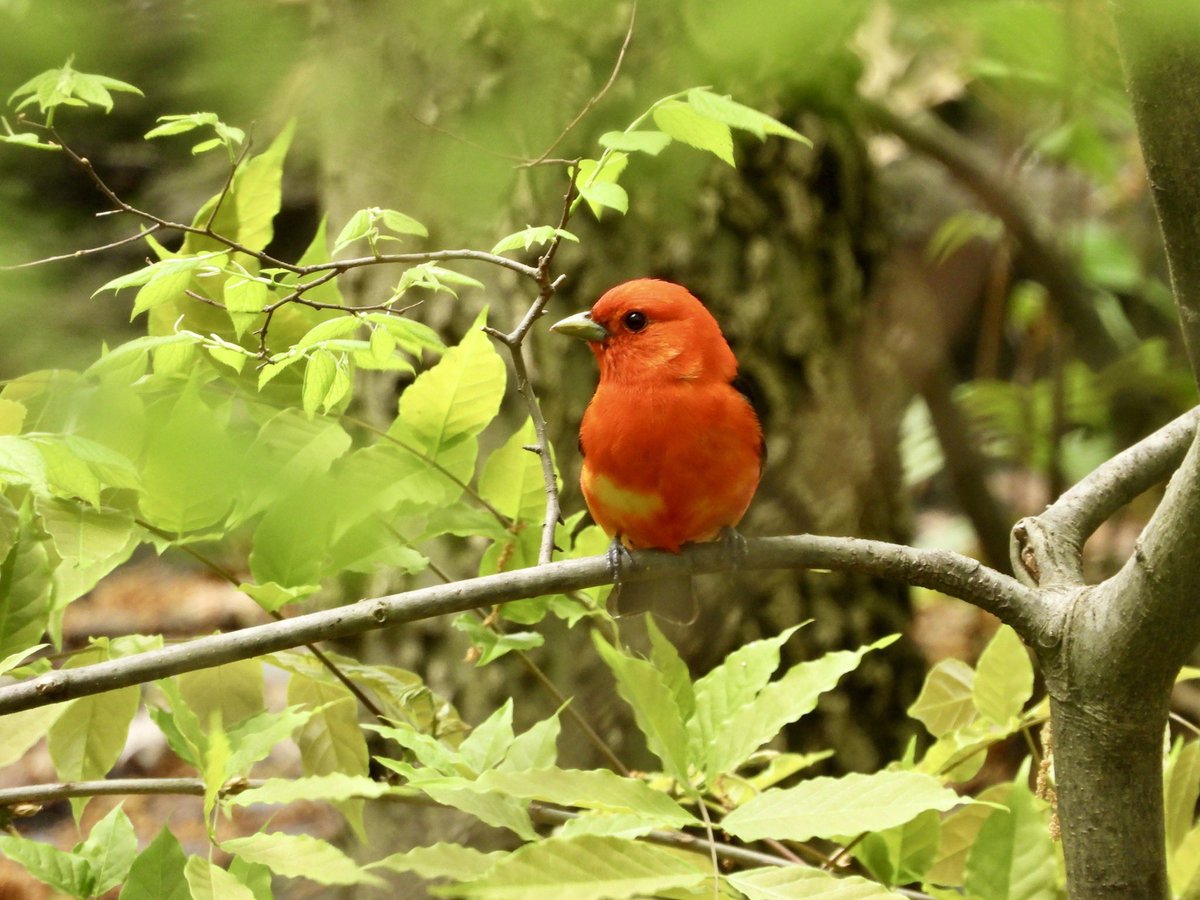 Color may vary… Scarlet Tanagers electrify the Ramble, Sunday, May 15.