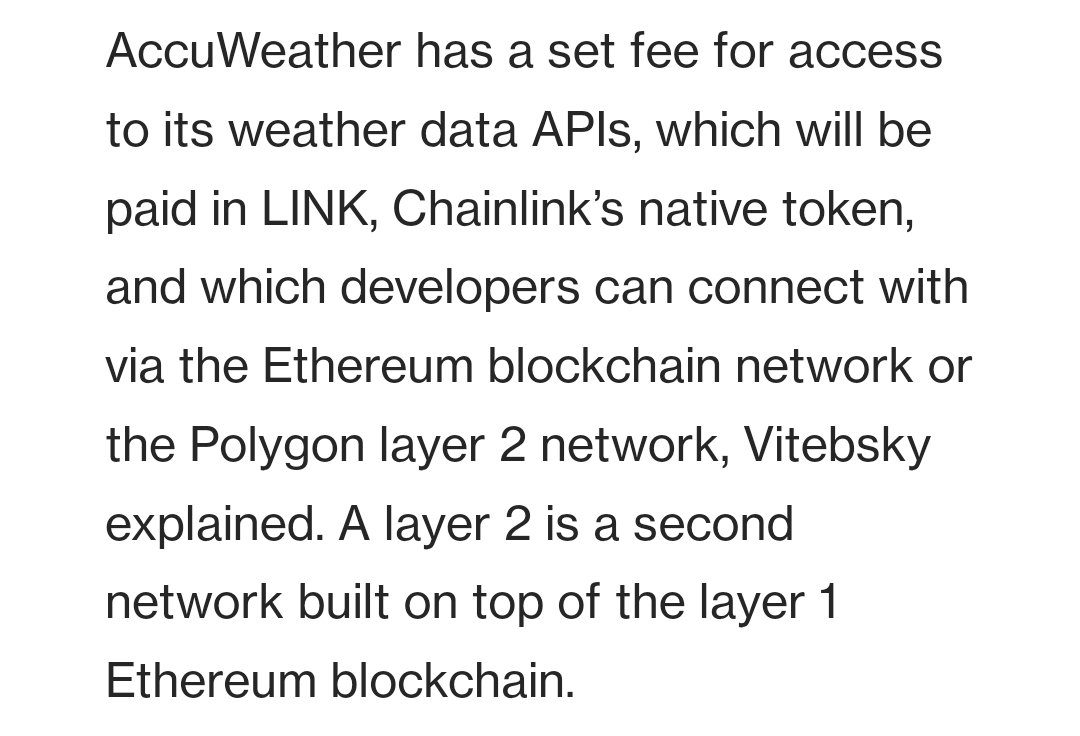 @AccuWeather#Chainlink node is live on mainnet!#Blockchain developers can now call the AccuWeather node to access premium weather data on-chain, such as precipitation by geolocation for powering parametric insurance & weather-related dApps. https://chn.lk/AccuWeather pic.twitter.com/oZ1qaPwtgi