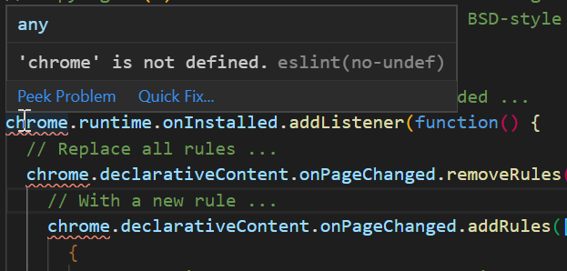 @geteslint: "env": { ... "webextensions": true, ... },#ChromeExtension pic.twitter.com/op3iZQF22j