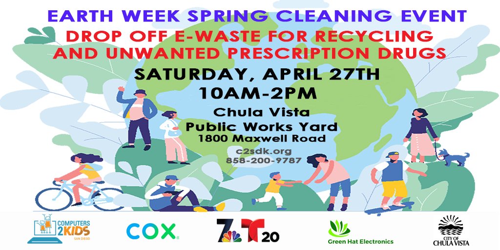 #ChulaVista Public Works Yard, 1800 Maxwell Rd., for an#EarthWeek spring cleaning e-waste recycling event See a full list of recyclable items at http://po.st/JbQm9y .pic.twitter.com/l1cZciULo0