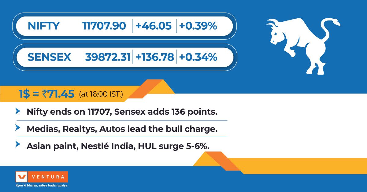 #ClosingBell | Indices end higher led by auto, media;#Nifty settles above 11,700-mark. Gainers: Asian Paints (+6%), Nestle (+4%). Losers: Infratel (-6%), ITC, Yes Bank (-5%).https://www.indiainfoline.com/markets/live-news/2020-02-03/Live-News-Sensex-Nifty-live-stock-markets-bse-nse-futures-and-options-derivative-trading … -