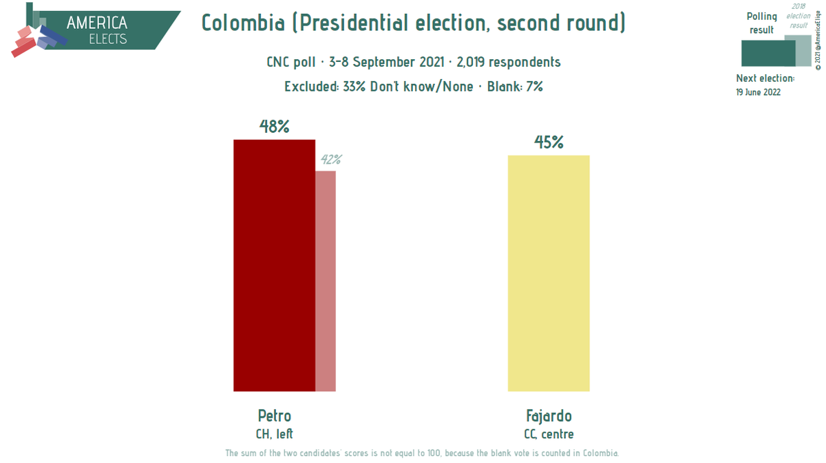 Colombia, CNC poll: Second round Petro (CH, left): 48% (+4) Fajardo (CC, centre): 45% (+1) Blank: 7% (-4) (+/- vs. June 2021) Fieldwork: 3-8 September 2021 Sample size: 2,019