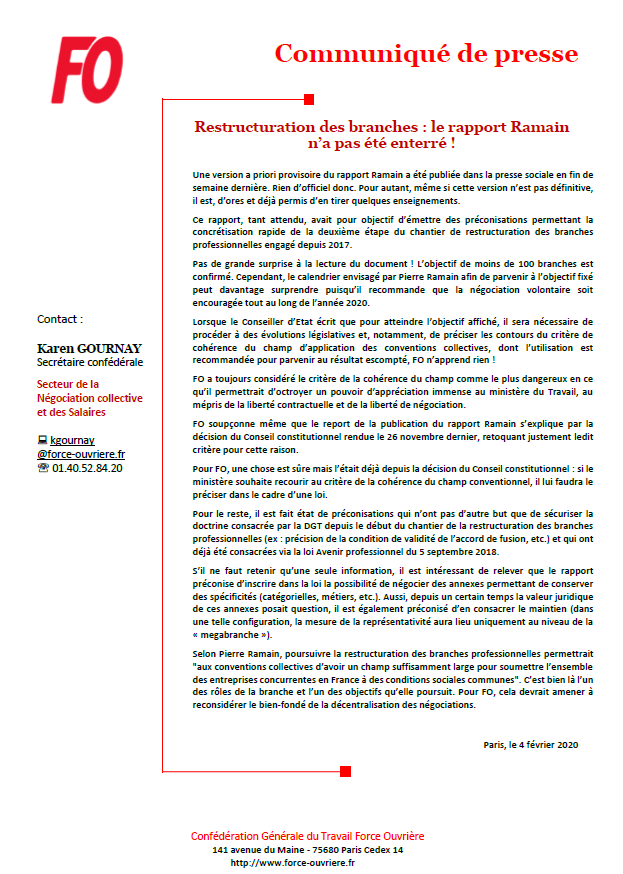 #Communiqué FO] Restructuration des#branches: le rapport#Ramain n'a pas été enterré! "FO a tjrs considéré le critère de cohérence du champ comme le + dangereux; il permettrait d’octroyer un pvr d’appréciat° immense au ministère du Travail, au mépris de la liberté de négociat°" pic.twitter.com/YQ4eST82mp