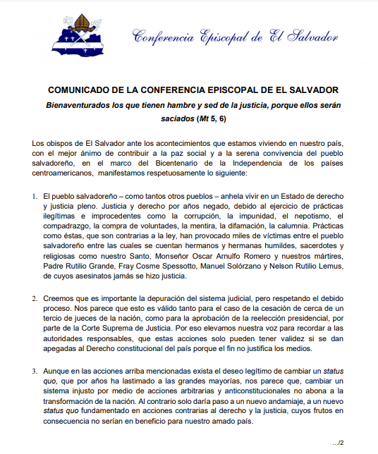 #ConferenciaDePrensa | Mons. Escobar Alas, Arzobispo de SS, da lectura al#ComunicadodePrensa de la Conferencia Episcopal de El Salvador, titulado "Bienaventurados los que tienen hambre y sed de la justicia, porque ellos serán saciados (Mt 5, 6)".