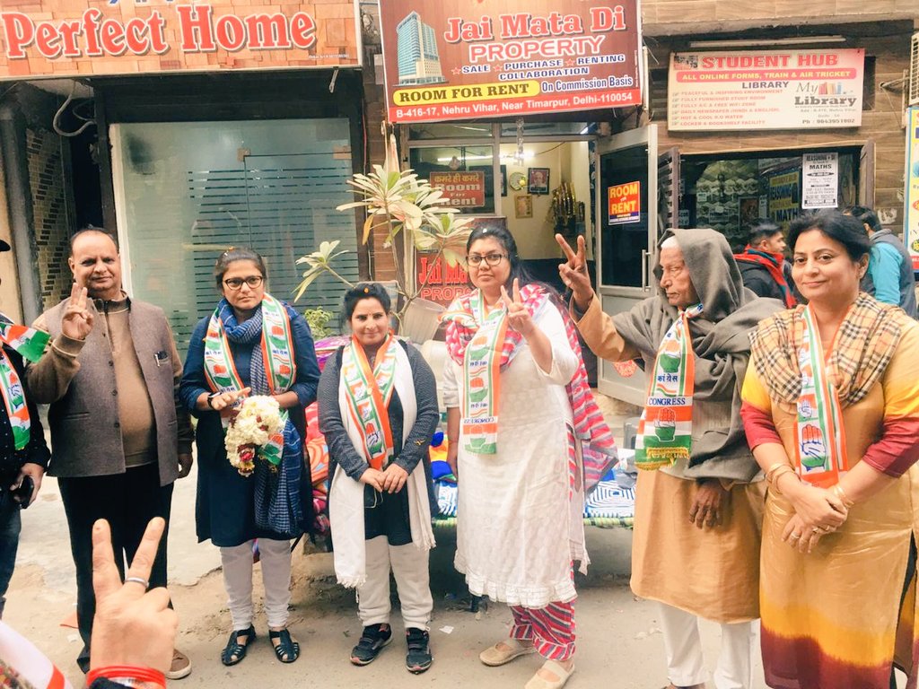 @sushmitadevinc campaigned door to door for INC Candidate from Timarpur@SangwanAmarlata She was joined by Jaynagar MLA & Gen Sec , AIMC@Sowmyareddyr and Gen Sec AIMC@shaminaaaa#CongressWaliDilli pic.twitter.com/Lqctj8OGub