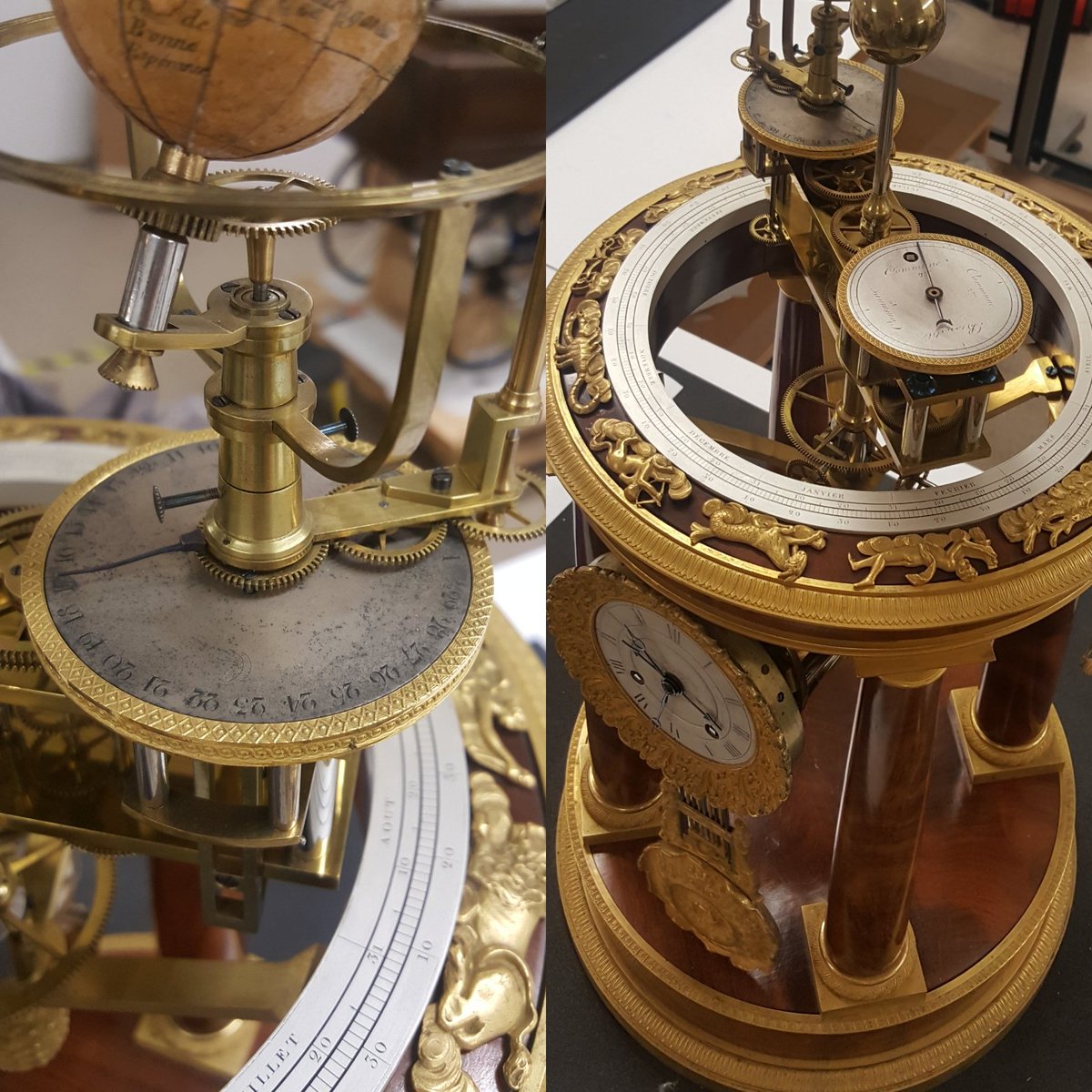 This wonderful object is in our lab undergoing treatment by our horologist. It is a clock with planetary models, made c1830. You can see the difference cleaning is making by looking at the dial faces in the below images.