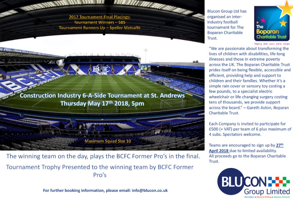 Blucon Group's annual #Construction Industry football tournament is coming up. All games will be played on the St Andrews pitch and the winning team on the day will play the#BCFC Former Pro's. Teams are encouraged to sign up as soon as possible due to limited availability!
