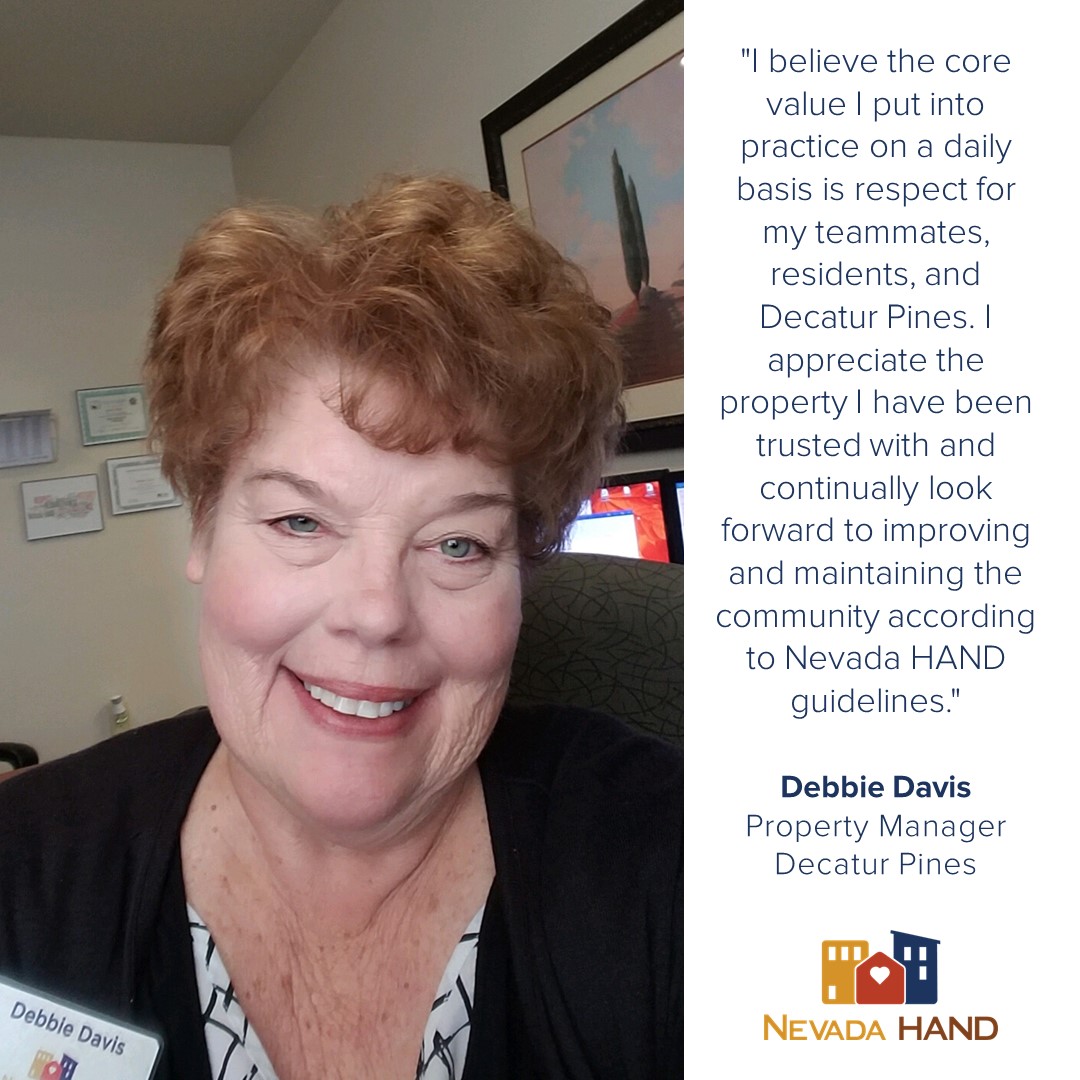 #WorkerWednesday! We asked Debbie Davis, our Property Manager at Decatur Pines, which one of Nevada HAND’s core values she practices daily and why. We have to say, Debbie’s answer is the best!#MoreThanAHome#CoreValues#NonProfit#NevadaHANDpic.twitter.com/NEeZb6GrOF