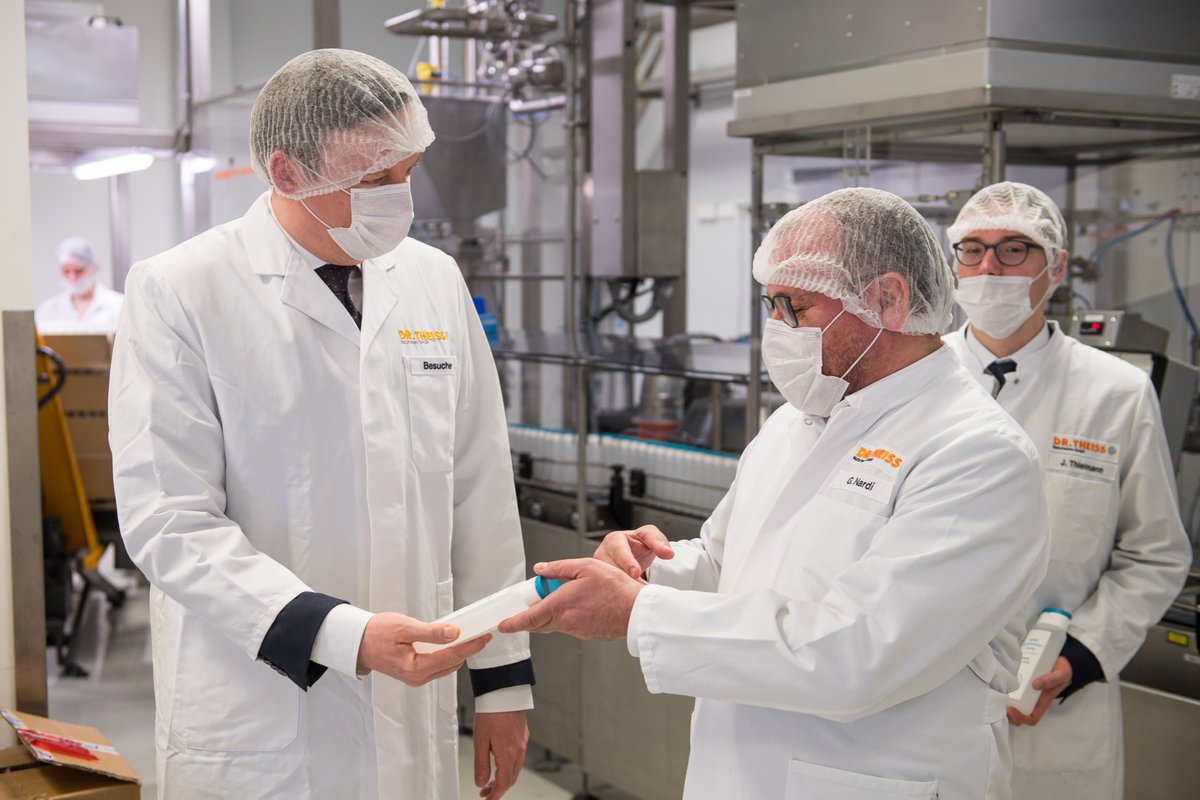 Naturwaren Theiss in Homburg wurde auf Initiative von MP Tobias Hans beauftragt, Desinfektionsmittel (84.000 Liter) für Krankenhäuser, Arztpraxen und Apotheken herzustellen. Das Foto zeigt seinen heutigen Besuch. (Foto: Staatskanzlei Saarland/Dietze)