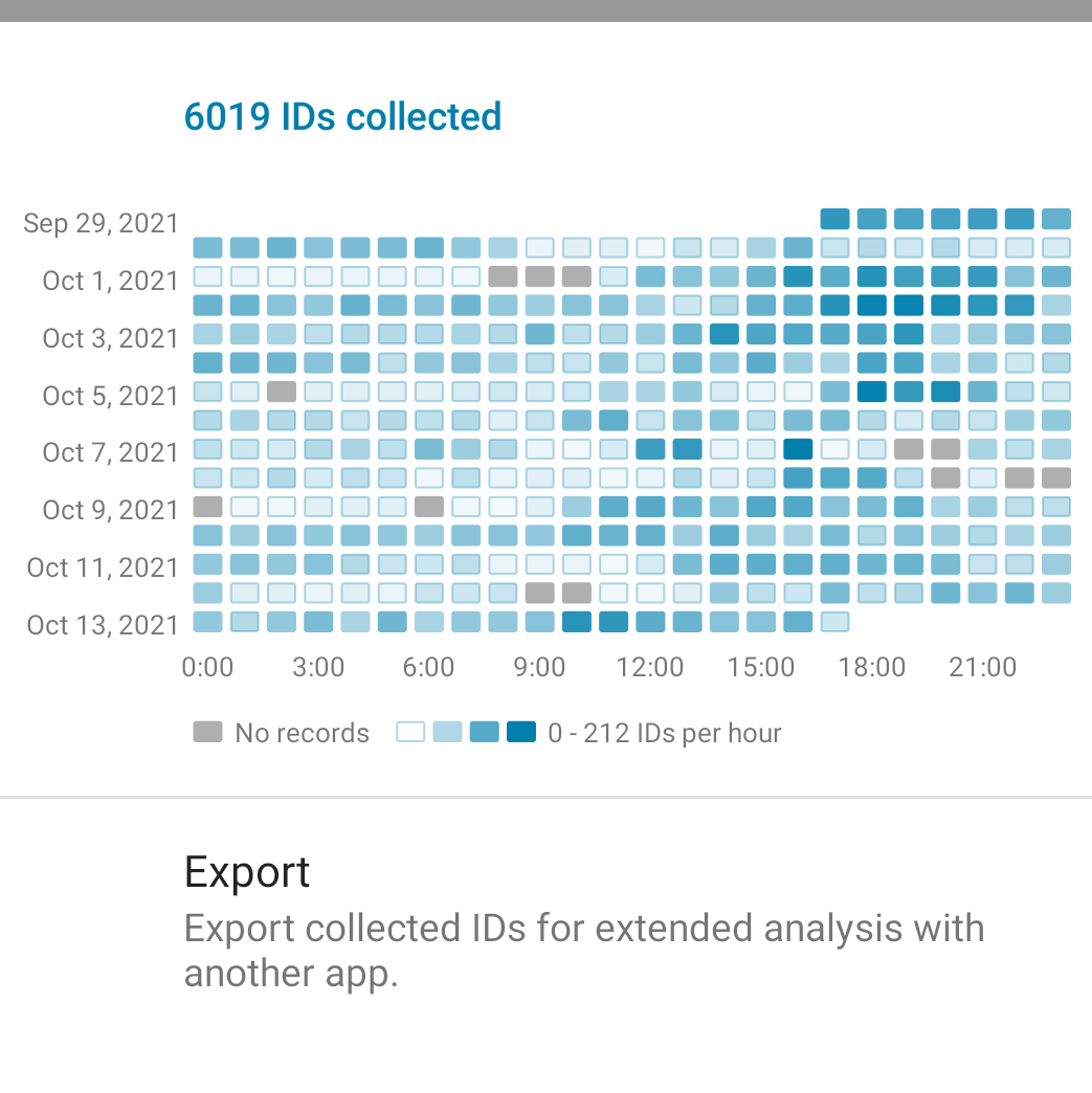 #CoronaWarnApp (Google-freie F-Droid-Version) ist ja diese Visualisierung, wann mein Telefon wie viele IDs eingesammelt hat. Da kann ich genau nachverfolgen, wann ich z.B. in der S-Bahn oder unterwegs viele Menschen getroffen habe. pic.twitter.com/oITRmduS0X