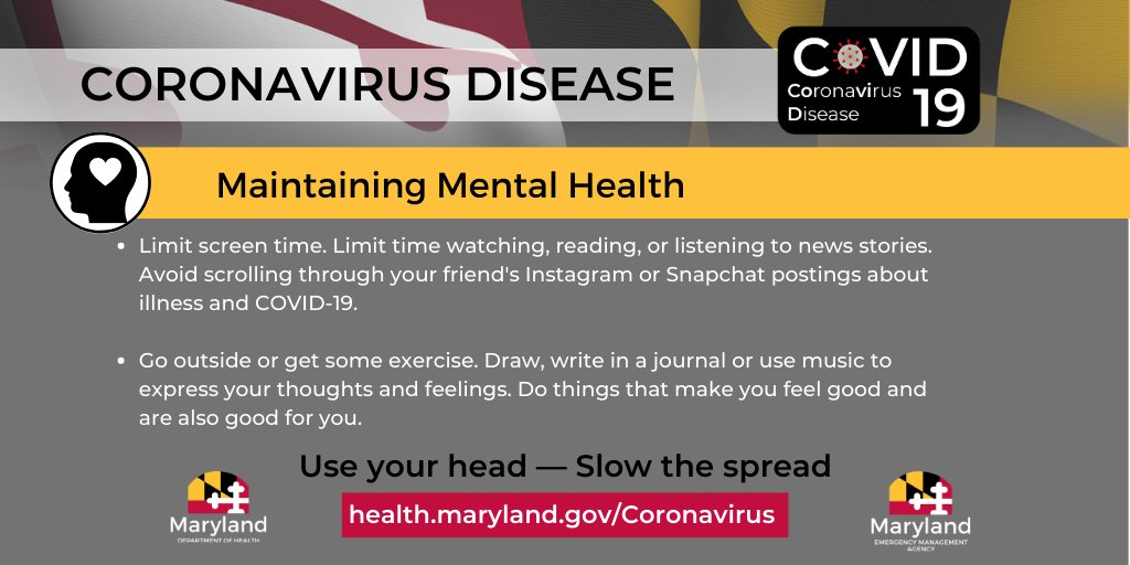 #coronavirusoutbreak? Limit screen time. Limit time consuming the news. Avoid scrolling through friend’s social media posts about COVID-19.@MDHealthDept. More health resources: https://coronavirus.maryland.gov pic.twitter.com/n7mVKzgSvS
