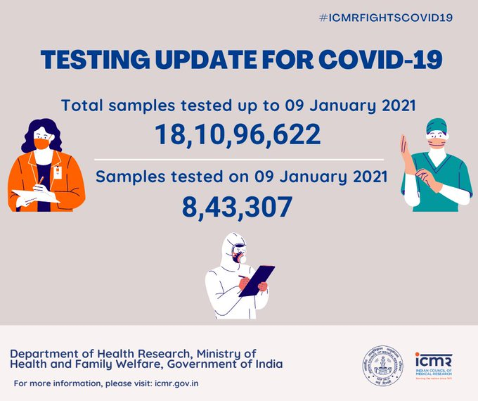 Total number of samples tested up to 9th January is 18,10,96,622 including 8,43,307 samples tested yesterday: Indian Council of Medical Research (ICMR)