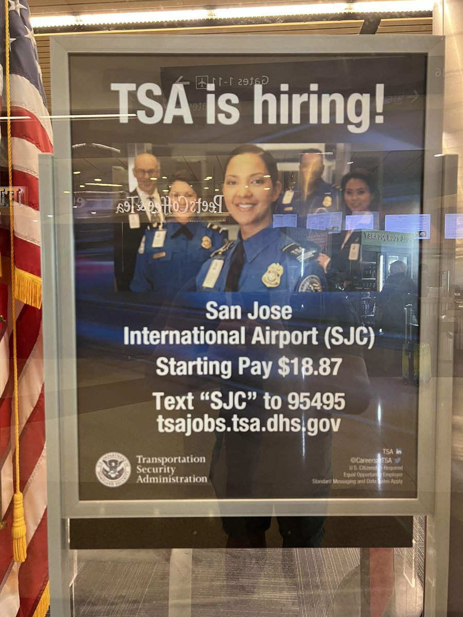 @TSA at@FlySJC is hiring. That’s good considering widespread staffing issues everywhere… Bad news is their starting pay as denoted is lower than that of#Costco about a mile away and El Pollo Loco just down the street. pic.twitter.com/1431P3Y3jG