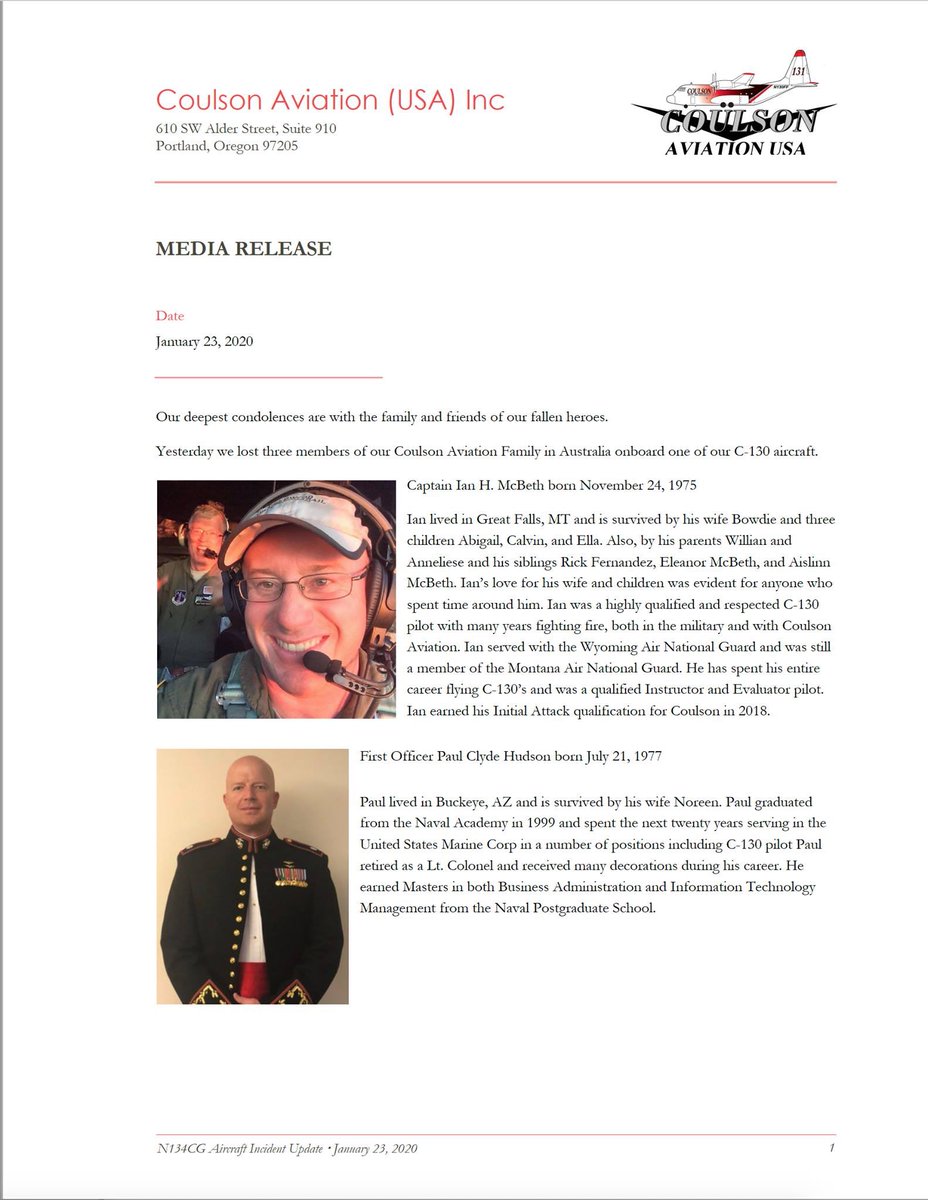 #CoulsonAviation C-130 Bomber134. On behalf of@AusAirForce thank you for your selfless service to our nation. Our heartfelt condolences to family and friends back home, the Coulson team, and the firefighting family here in Australia. -