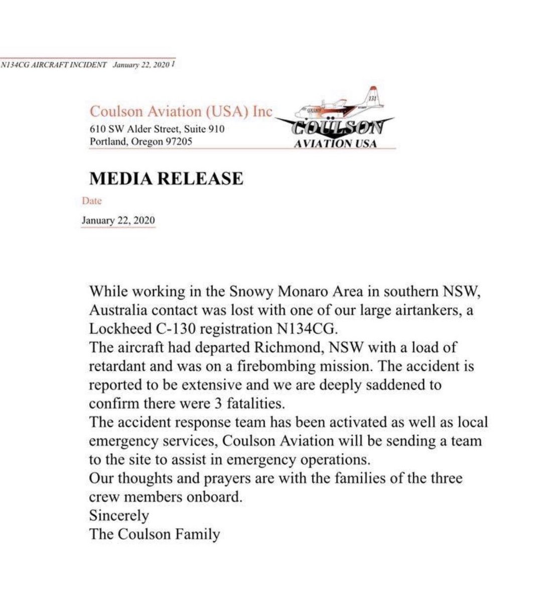 Se ha estrellado un #C130 de#CoulsonAviation en Australia mientras luchaba contra los incendios forestales. Por desgracia, hay 3 fallecidos