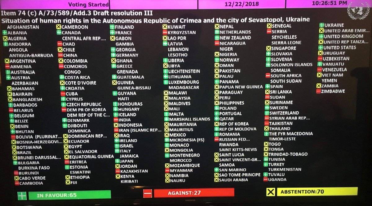 @UN General Assembly has passed a resolution on human rights violations in occupied#Crimea in 65-27 vote. It demands#Russia return occupied territories to#Ukraine, release political prisoners held in Crimea and Russia & stop discrimination against those who oppose occupation.pic.twitter.com/HxJyBH8lPh