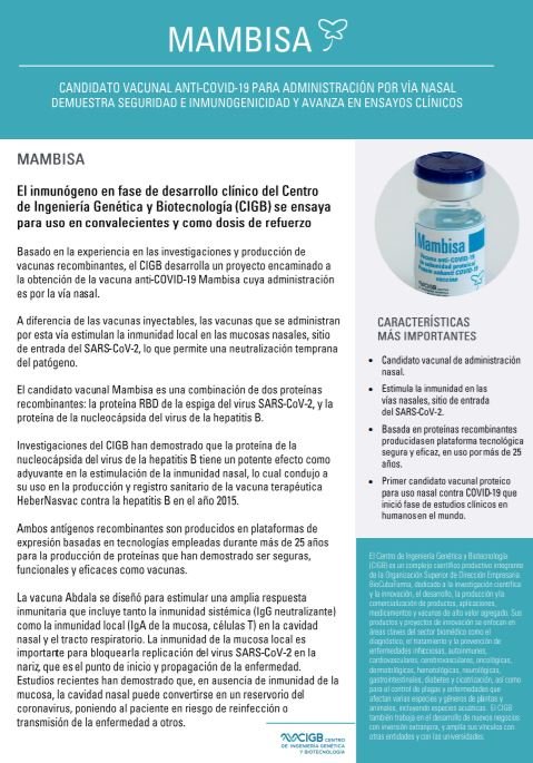 #Mambisa from@CIGBCuba, is the first protein vaccine candidate for nasal use against#COVID -19, which began clinical trials in humans in the world.#VacunasCubanasCovid19 ,#CubaEsCiencia . pic.twitter.com/UmKfc0AjsQ