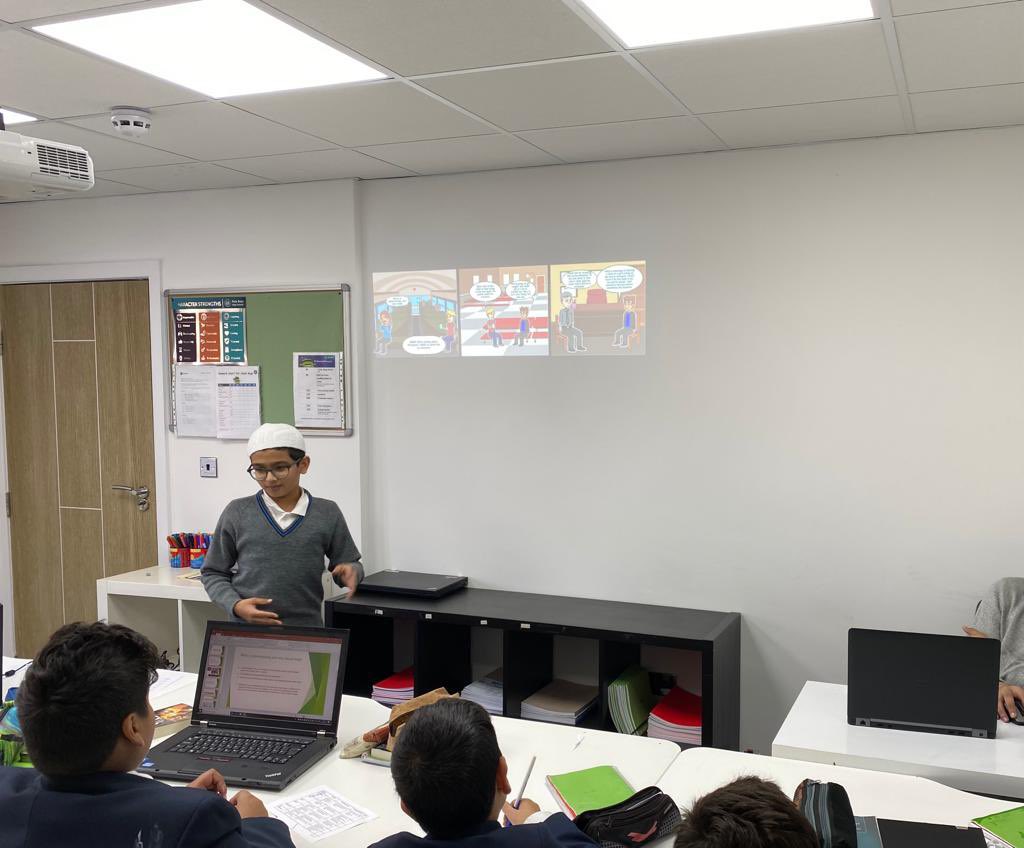 Year 7’s confidently delivering a presentation on cyber bullying, whilst their classmates score the presentation on a number of criteria.