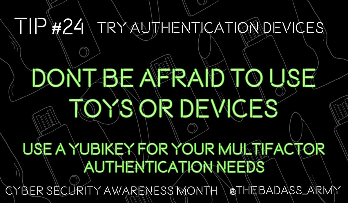 #CyberSecurityMonth tip, before we found out about our partnership with Yubico! “Tip 24 don’t be afraid to use toys or devices. Use a yubikeys for your multi factor authentication needs!” pic.twitter.com/8AnL6E814O