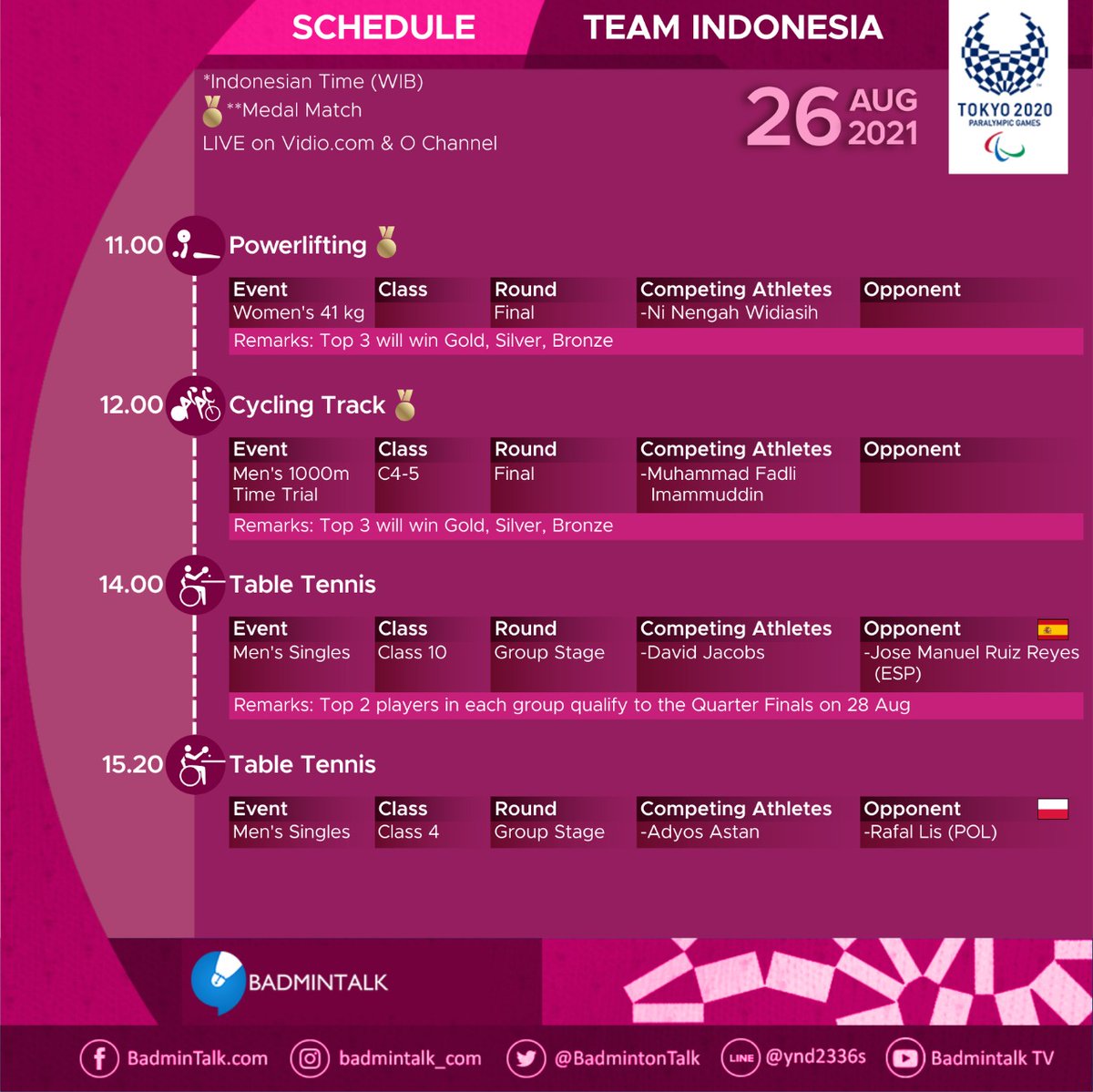 Schedule of TEAM INDONESIA Day 2: Thu, 26 Aug 2021 All the best for all athletes! Classification