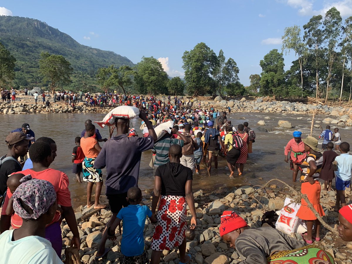 Bread being carried over to assist those at the other side of the washed away bridge.