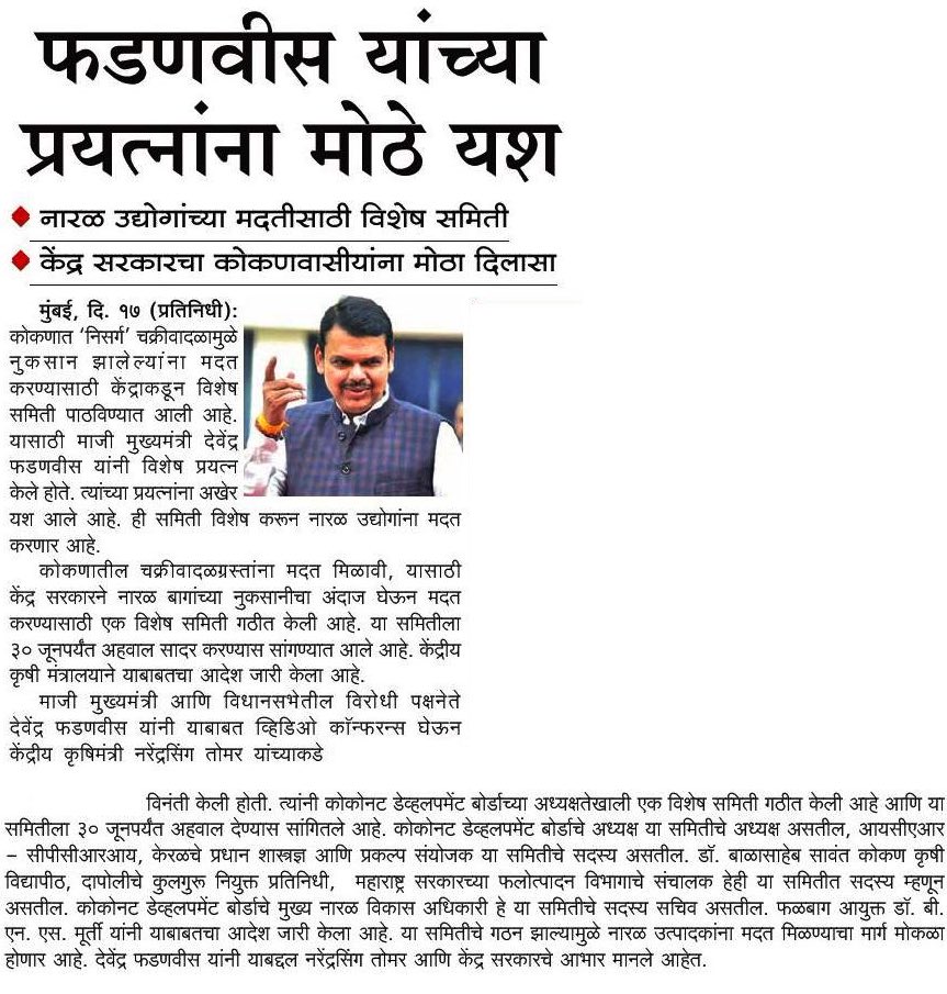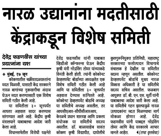 Special team of Coconut Development Board is visiting Konkan on 23rd and 24th June, to assess damage and losses caused due to