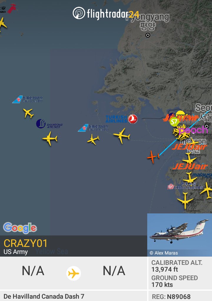 Us Army N89068 Dehavilland DHC-7-102 c/n 88 seen cruising west of Seoul, asouth Korea and south of Pyongyang, North Korea