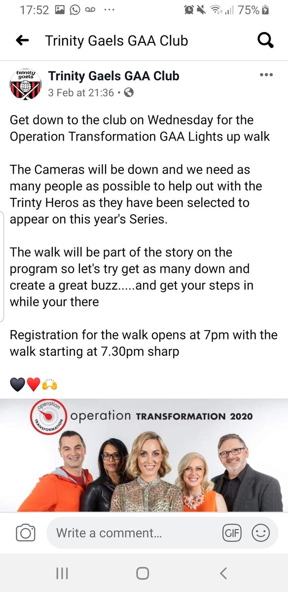 @GaisceAward students have been working with the Trinity Heroes inclusion group@trinitygaels1. They are doing amazing work & we are so proud of themTrinity Gaels would like to see a huge turnout tonight as they are filming for Operation Transformation!#meas#dea-chroí pic.twitter.com/gnIAfgXOBZ