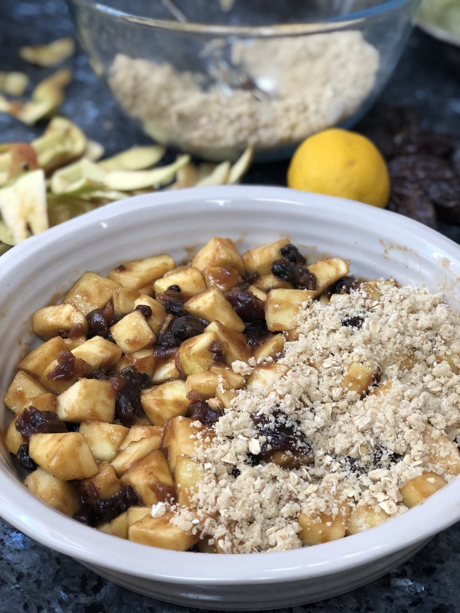 Toffee apple Crumble in the making .. currently having heated discussion whether clotted cream or vanilla icecream is the best accompaniment..