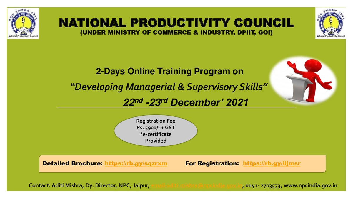 Online Training Programme on “Developing Managerial & Supervisory Skills” Register Now:-https://www.npcindia.gov.in/NPC/User/webinar_registration?course_select_id=MTU2NA== … Contact:-9928226777, email: aditi.mishra@npcindia.gov.in Date:-22.12.2021 and 23.12.2021. Fee:-Rs.6962/-
