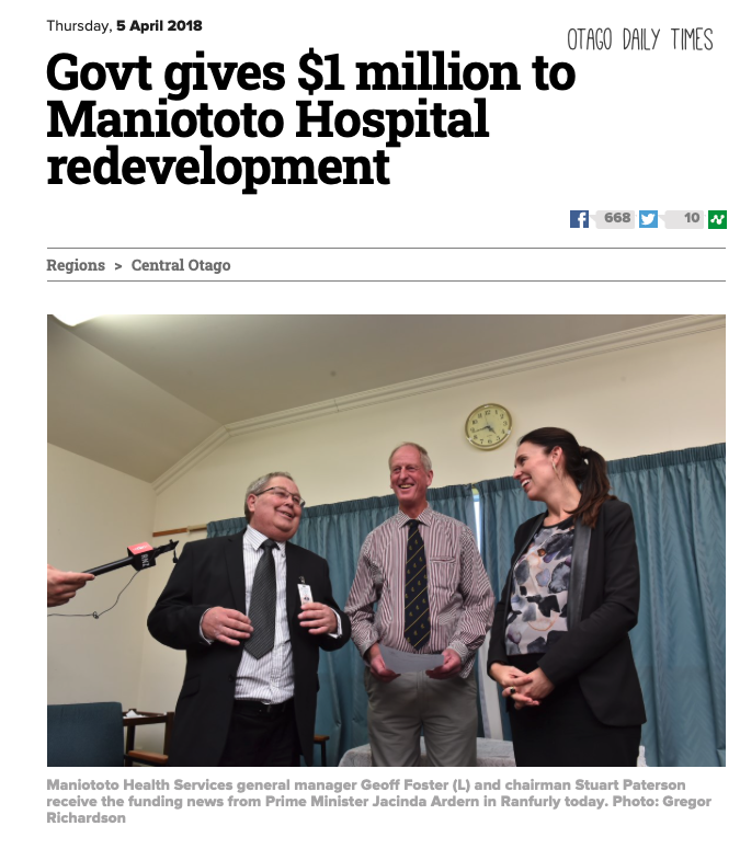 @NZNationalParty 'cares' so much about regional health that they failed to fund the Maniototo hospital in Ranfurly & left it to the community to find the last $1m Then@nzlabour was elected & the final $1m was paid by the state. Not buying their crocodile#DHB tears pic.twitter.com/Dqt27Ac6t1