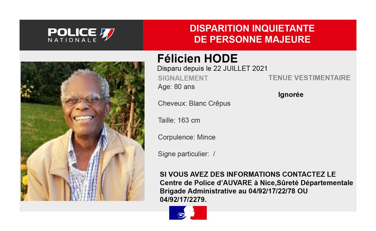 #DisparitionInquiétante] Monsieur Félicien HODE, âgé de 80 ans,atteint de la maladie d'Alzheimer a disparu de son domicile depuis le 22 juillet 2021. Susceptible de fréquenter le Vieux#Nice06 et la ville de#CagnesSurMer. Aidez-nous à le retrouver MERCI de#RT.pic.twitter.com/xf94zCeCXM