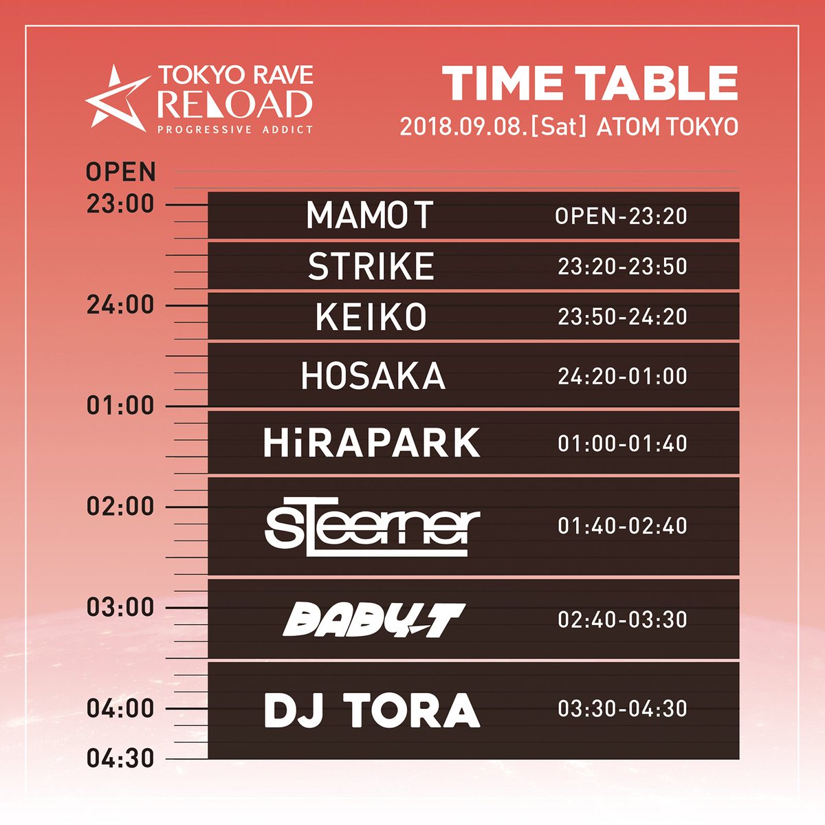 【TimeTable】 2018年9月8日 (Sat) @ ATOM TOKYO TOKYO RAVE x Reload Guest Steener