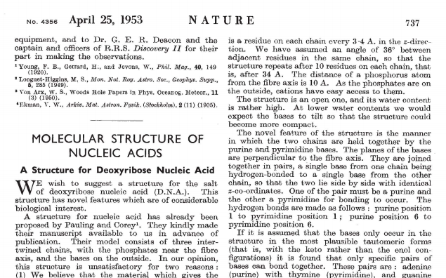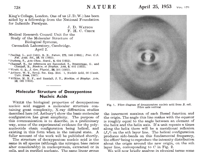 Happy #DNAday everyone! On this day in 1953, three papers on the structure of DNA were published back-to-back in@nature, authored by Watson, Crick, Franklin, Gosling, Wilkins, Stokes, and Wilson.#DNA#DNADay19
