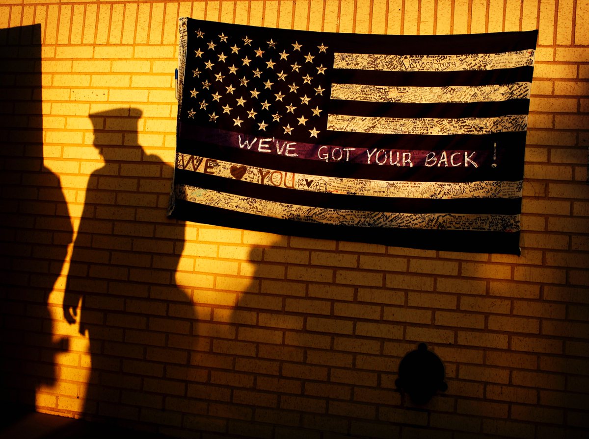An officer's shadow is reflected on a flag reading "We've got your back" as the sun sets on the