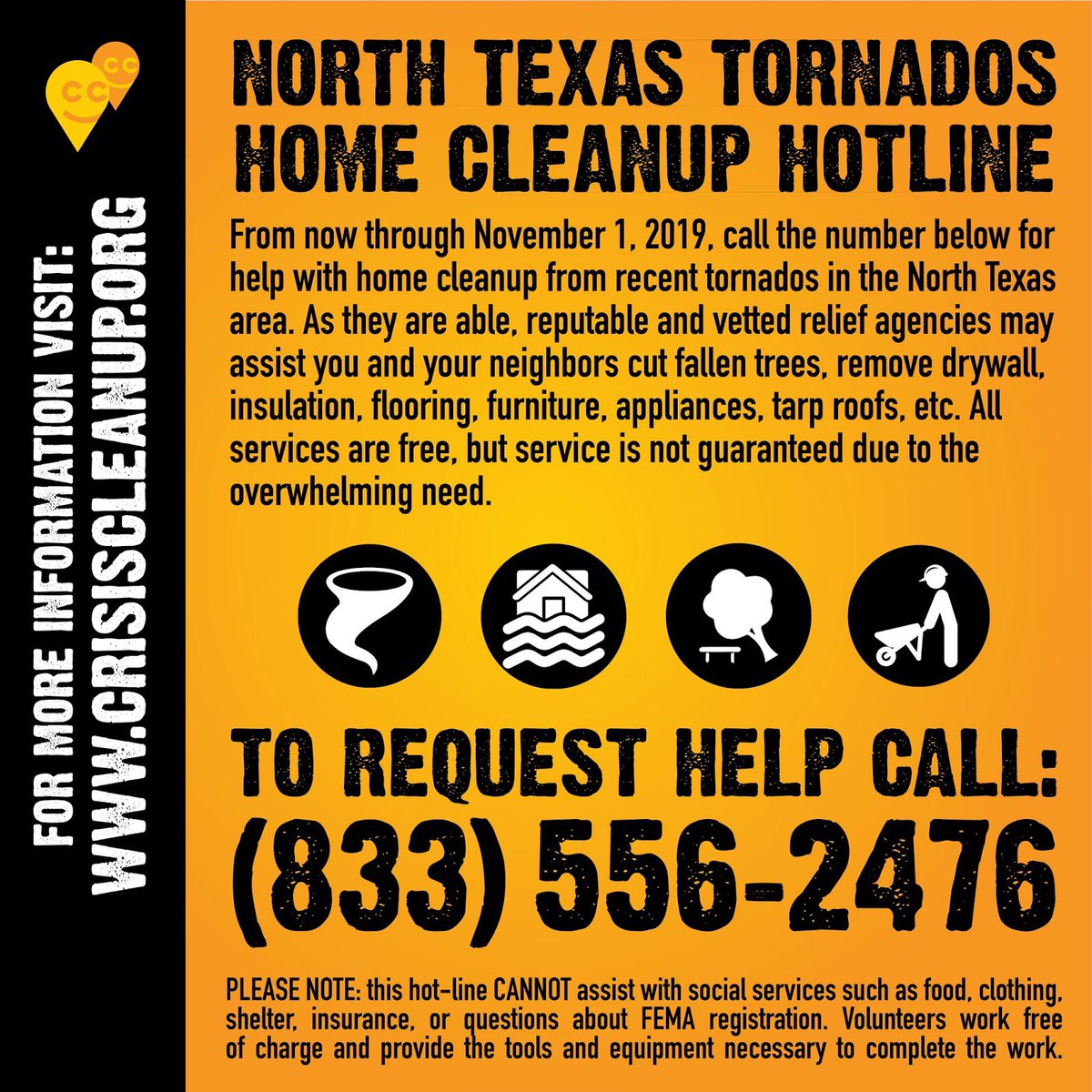 The Crisis Cleanup Hotline number has been activated for North Texas. From now through November 1, 2019, residents can call 833-556-2476 to register their home for clean up assistance.