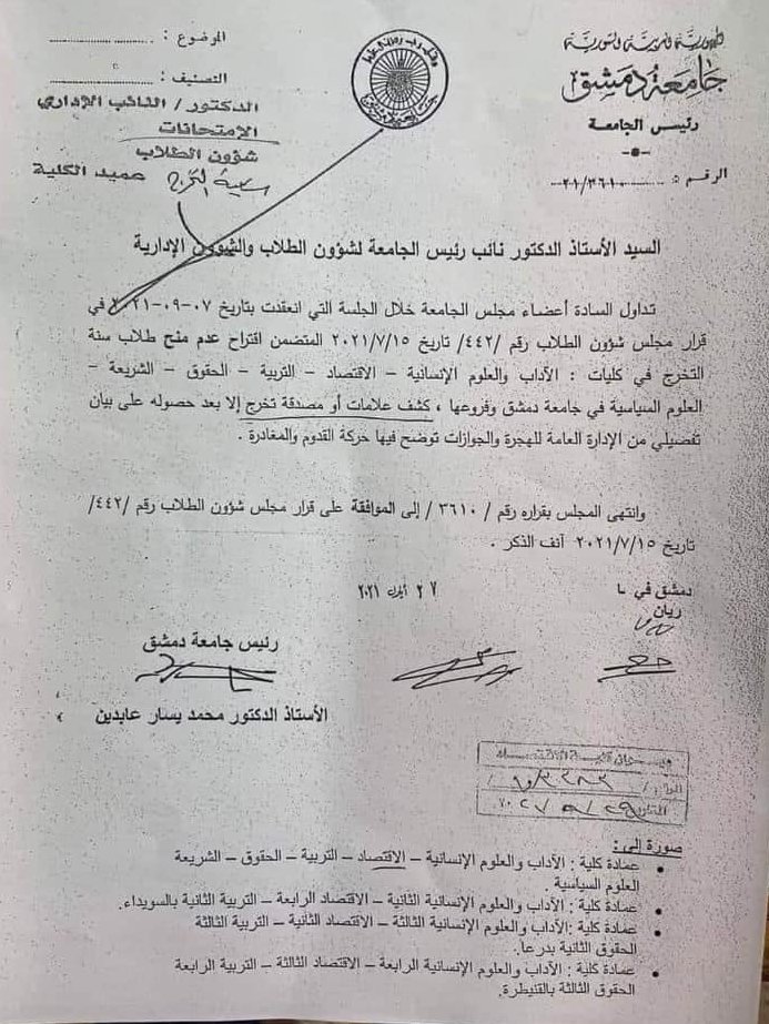 #Damascus University issues a decision not to grant transcripts of grades or certificates of graduation to its graduates unless they obtain a detailed statement from the Immigration & Passports Department explaining the movement of arrival & departure to & from#Syria.pic.twitter.com/Lx1I8paYVd