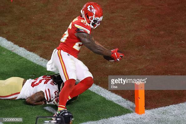 #DamienWilliams #26 of the Kansas City#Chiefs dives into the endzone to go up 24-20 over the San Francisco#49ers in the fourth quarter in#SuperBowl