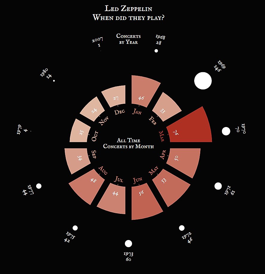 Sharing a recent visualization I put together using D3 - visualizing when Led Zeppelin concerts occurred (by month and year). I found it interesting the number of performances in 1969 - just one year after the band was formed.