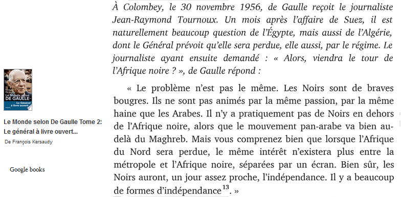 30 novembre 1956 : "les Noirs sont de braves bougres. Ils ne sont pas animés par la même passion, par la même haine que les Arabes" dit