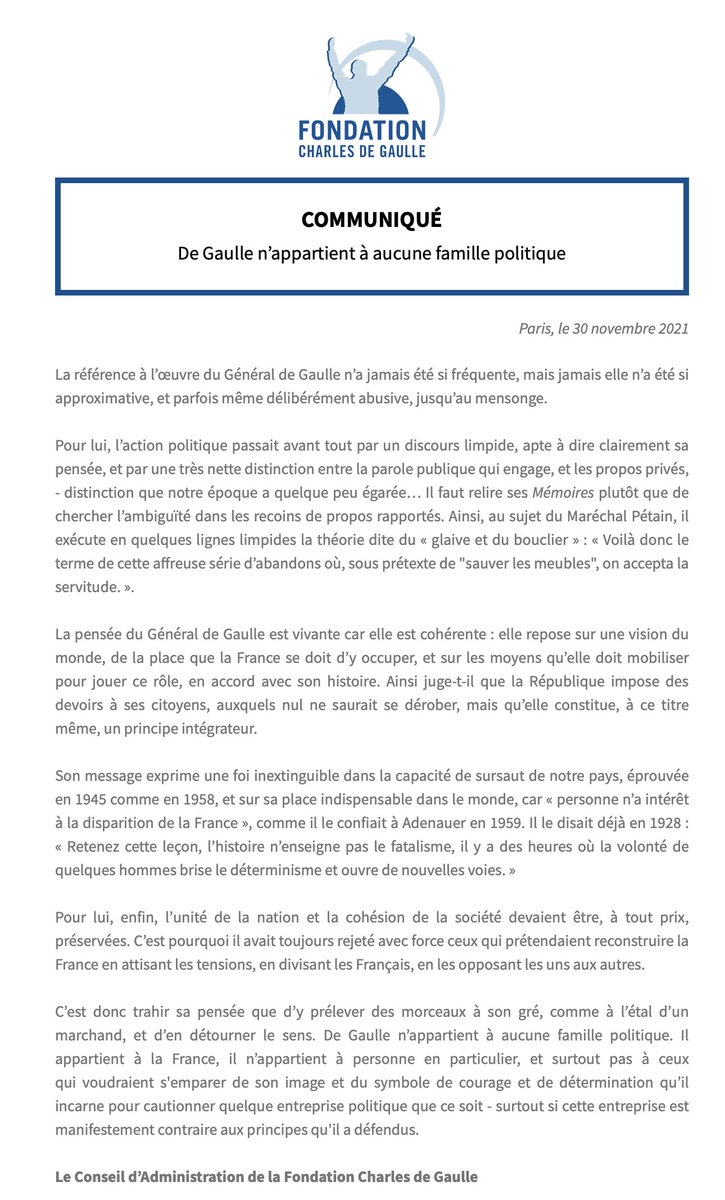 #deGaulle appartient à tous. Totalement en phase avec le communiqué de@Fondation_CdG sur la vitalité du#gaullisme et de ses ses principes, mais aussi sur l’importance d’éviter toute forme de récupération, notamment par l’extrême-droite qui n’a fait que le combattre. pic.twitter.com/ki1aV5uTIm -