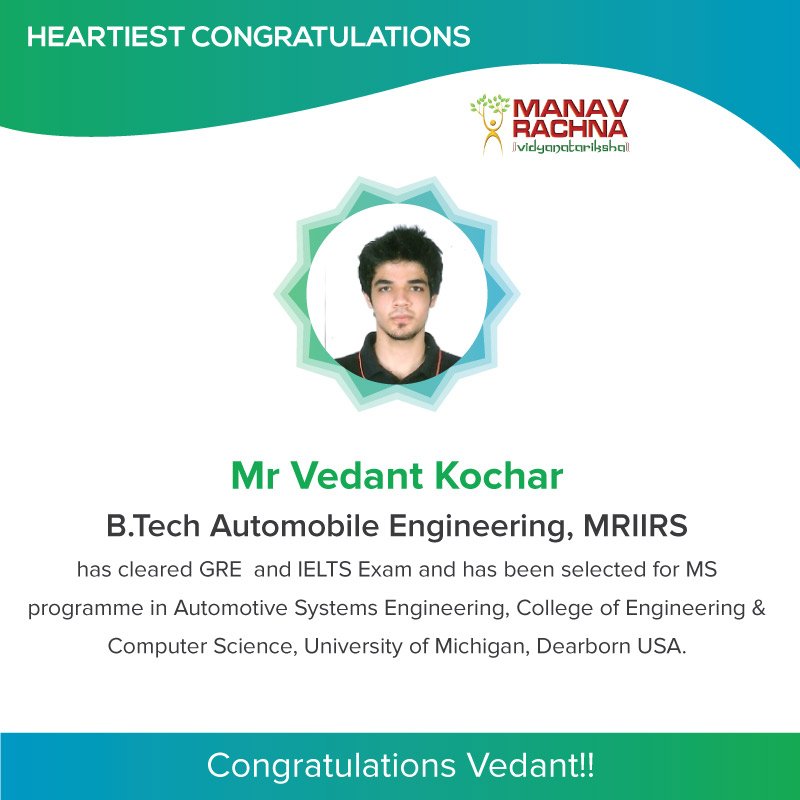 #AutomobileEngineering,#MRIIRS has cleared GRE and IELTS Exam and has been selected for MS programme in#AutomotiveSystemsEngineering, College of Engineering & Computer Science,#UniversityofMichigan,#Dearborn#USA. Congratulations!! pic.twitter.com/gLVWTotYyU