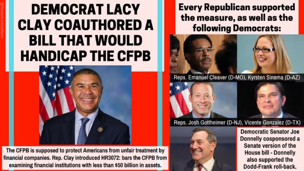 @LacyClayMO1's bill would weaken Consumer Financial Protection Bureau while he and other Dems tweet:#DefendCFPB Civil rights group @WeAreUnidosU letter against#HR3072: http://bit.ly/2DenMQG pic.twitter.com/bVd8YVbvQu