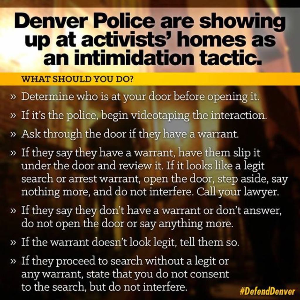 Warning: from Denver Activists. DPD harassing police brutality protest organizers @ their homes https://twitter.com/Aut0nomous/status/631576794177609728 …