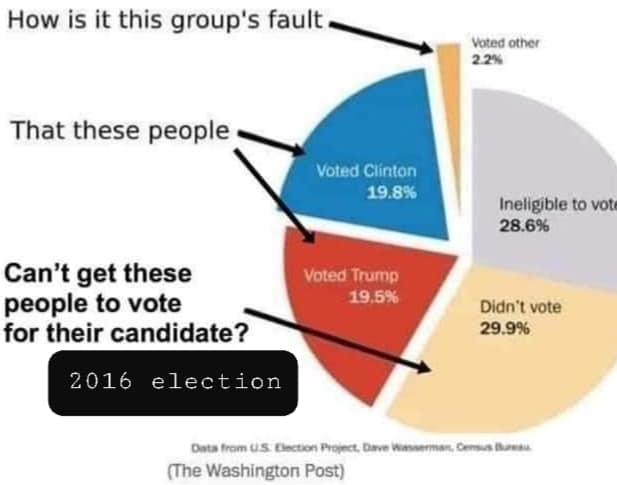 In 2016, 29.9% of eligible voters didn't vote. A Libertarian or Green Party vote is NOT a vote for Trump or Biden. Quit believing or telling that lie. Focus on the 29.9%.