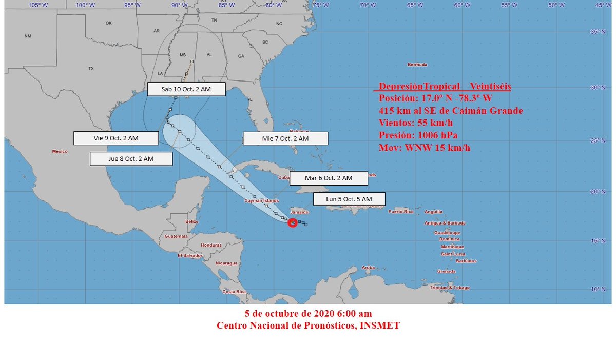 #AvisodeCiclónTropical#DepresiónTropical Veintiséis. 05/10/2020 6:00 am Con poco cambio en la madrugada en el Caribe central. Por la cercanía de este sistema a nuestro país, las condiciones favorables para su intensificación hoy y mañana martes, así como... pic.twitter.com/Xb5GqYm7j5