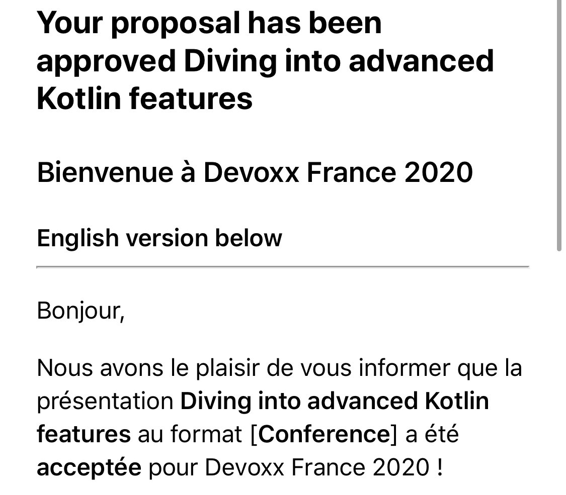 @DevoxxFR d'avoir sélectionné notre proposition "De webflux en java aux coroutines en Kotlin, le parcours du combattant ?"@yaourtcorp. See you at#devoxxfr 2020 ! pic.twitter.com/yJfe2I3VNJ -