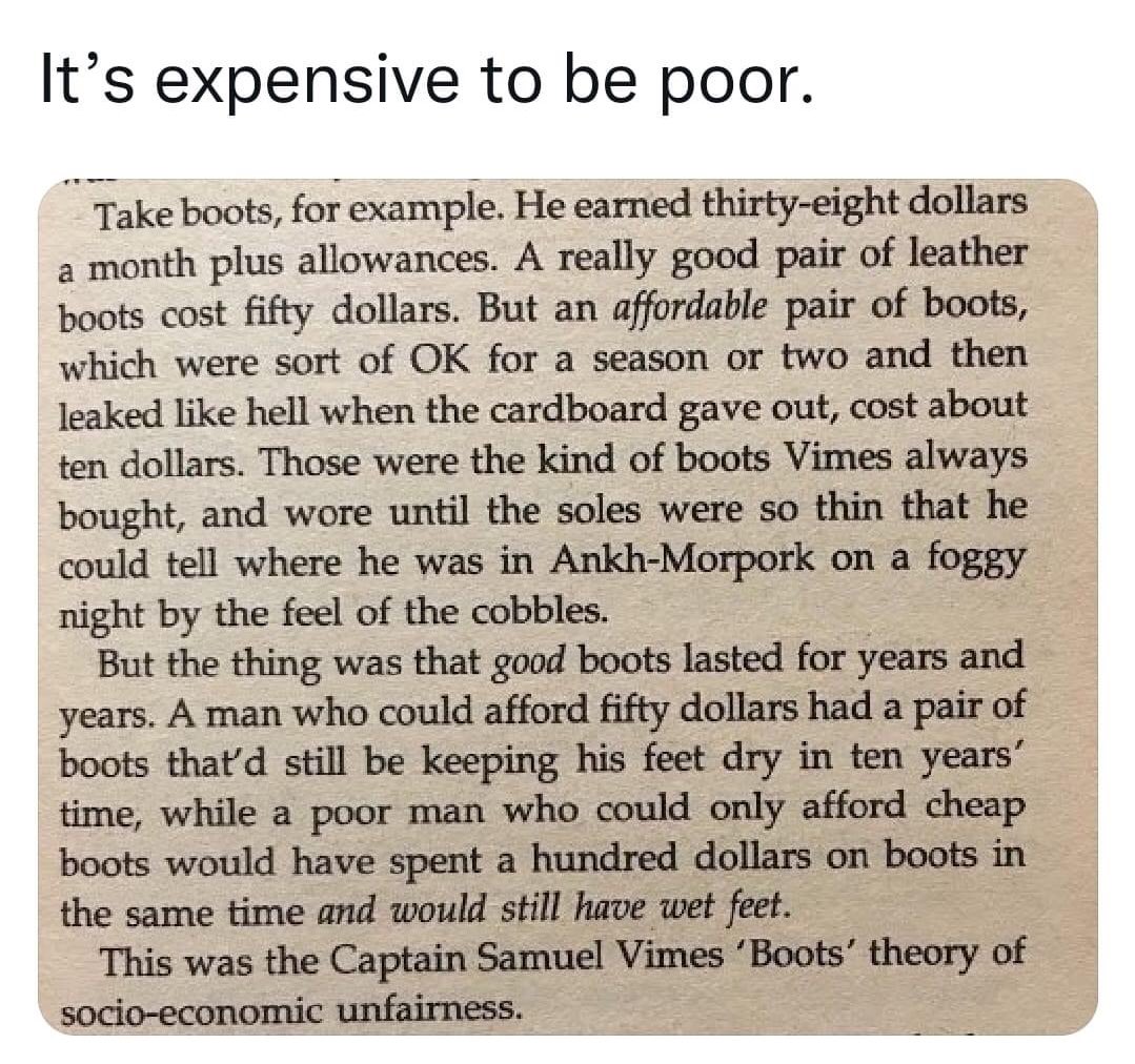 I started reading Discworld novels as a moderately young person, when a lot of opinions about world and stuff are just forming, and I often think about how often he was just so on point. Take for example, the boots theory.