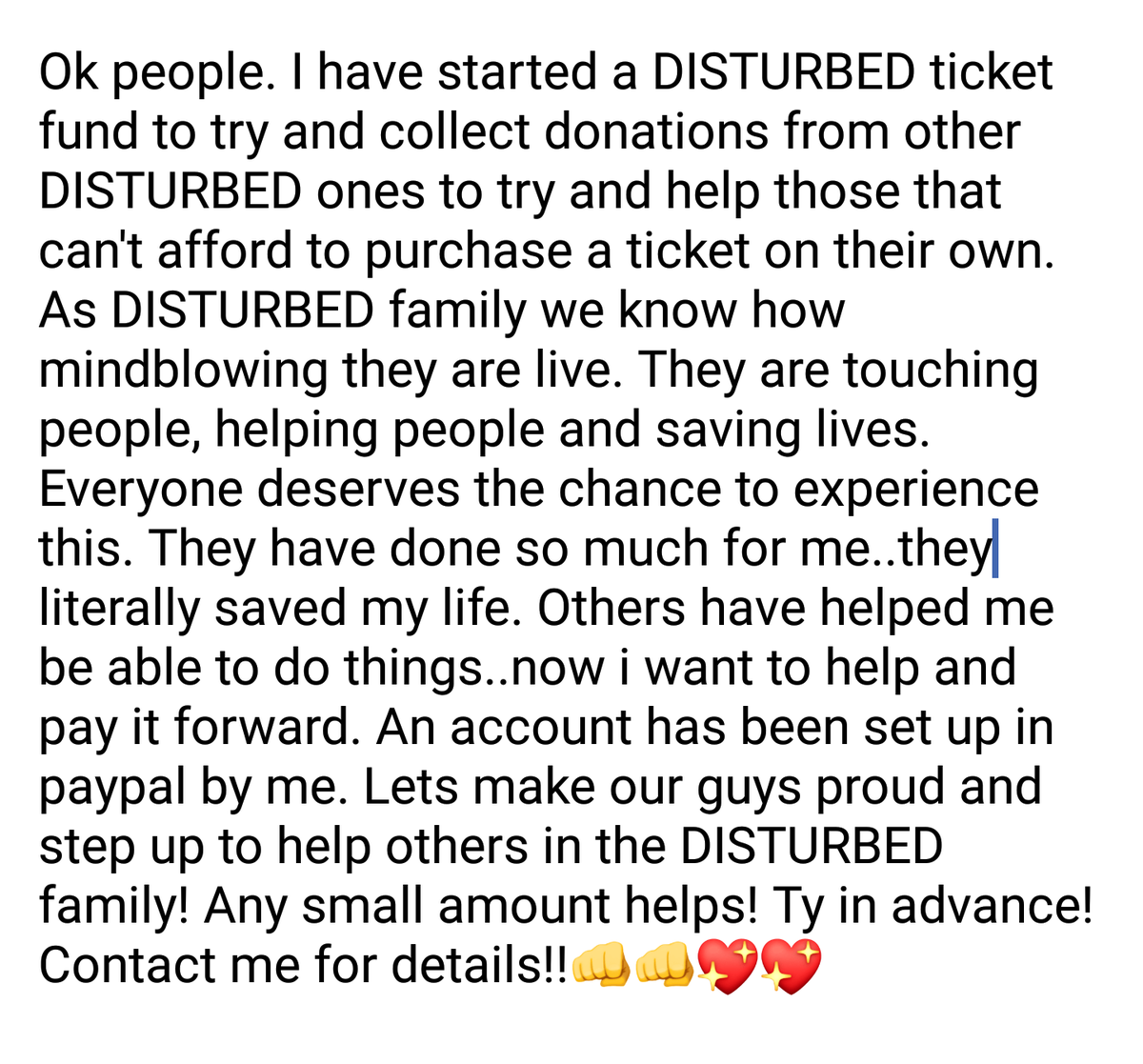 Please share and help if you can! I want to help as many DISTURBED fans as i can be able to experience seeing them live!