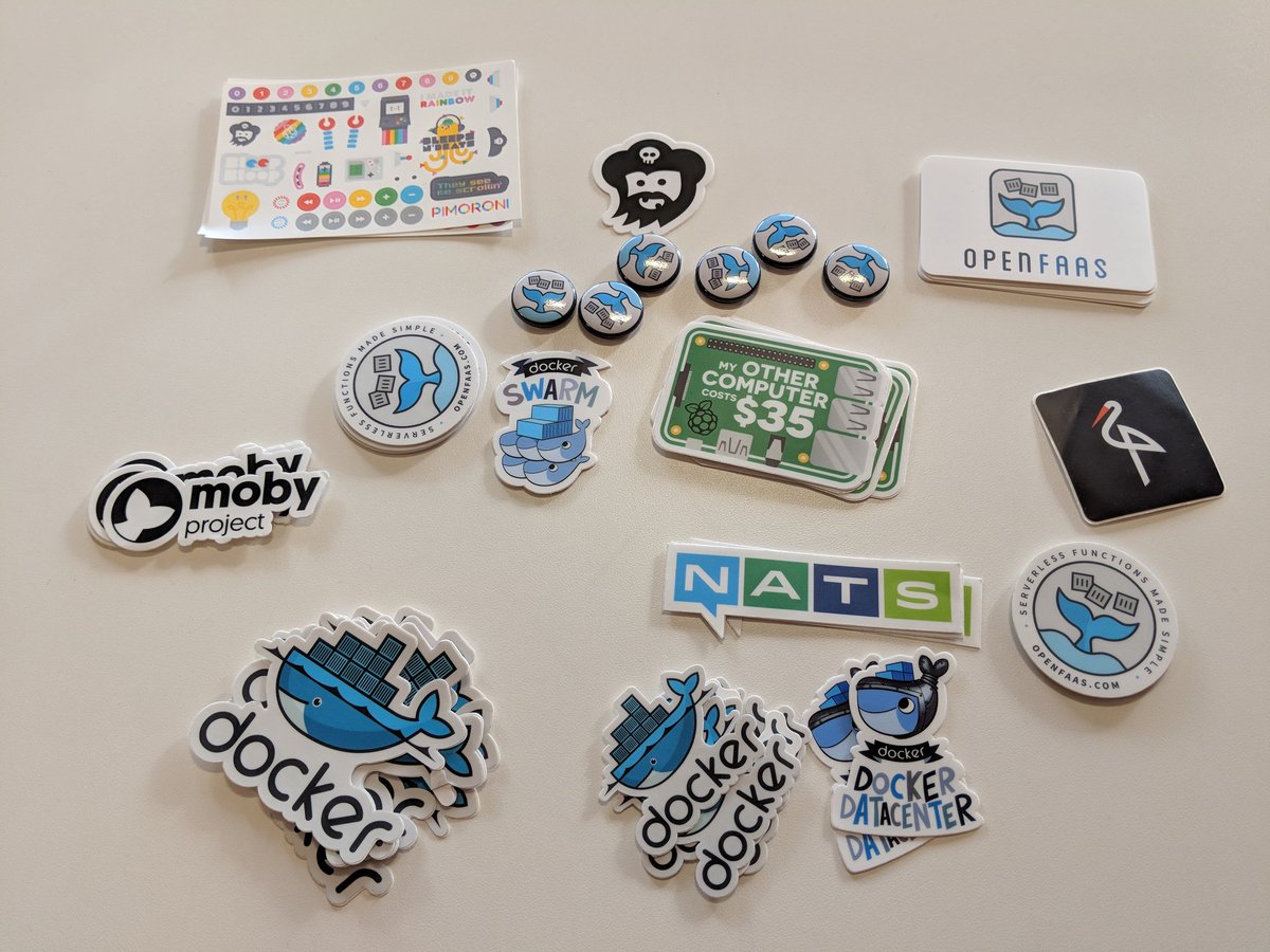 #FaaSFriday and my last day at ADP so I've started a sticker table with all my favourites#DockerCaptain@moby@openfaas@nats_io@Raspberry_Pi@pimoroni@Minio@Dockerpic.twitter.com/cDvPvPmJde